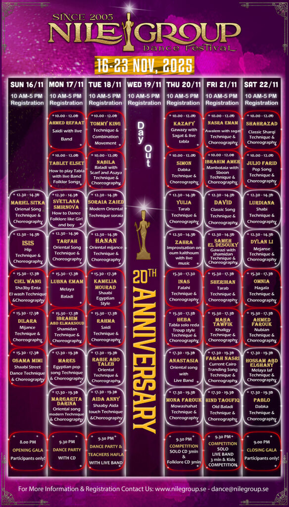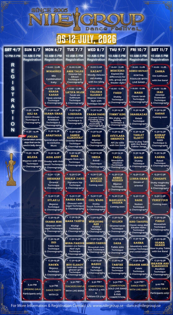 All reservations have to be done through the Nile Group mail: dance@nilegroup.se